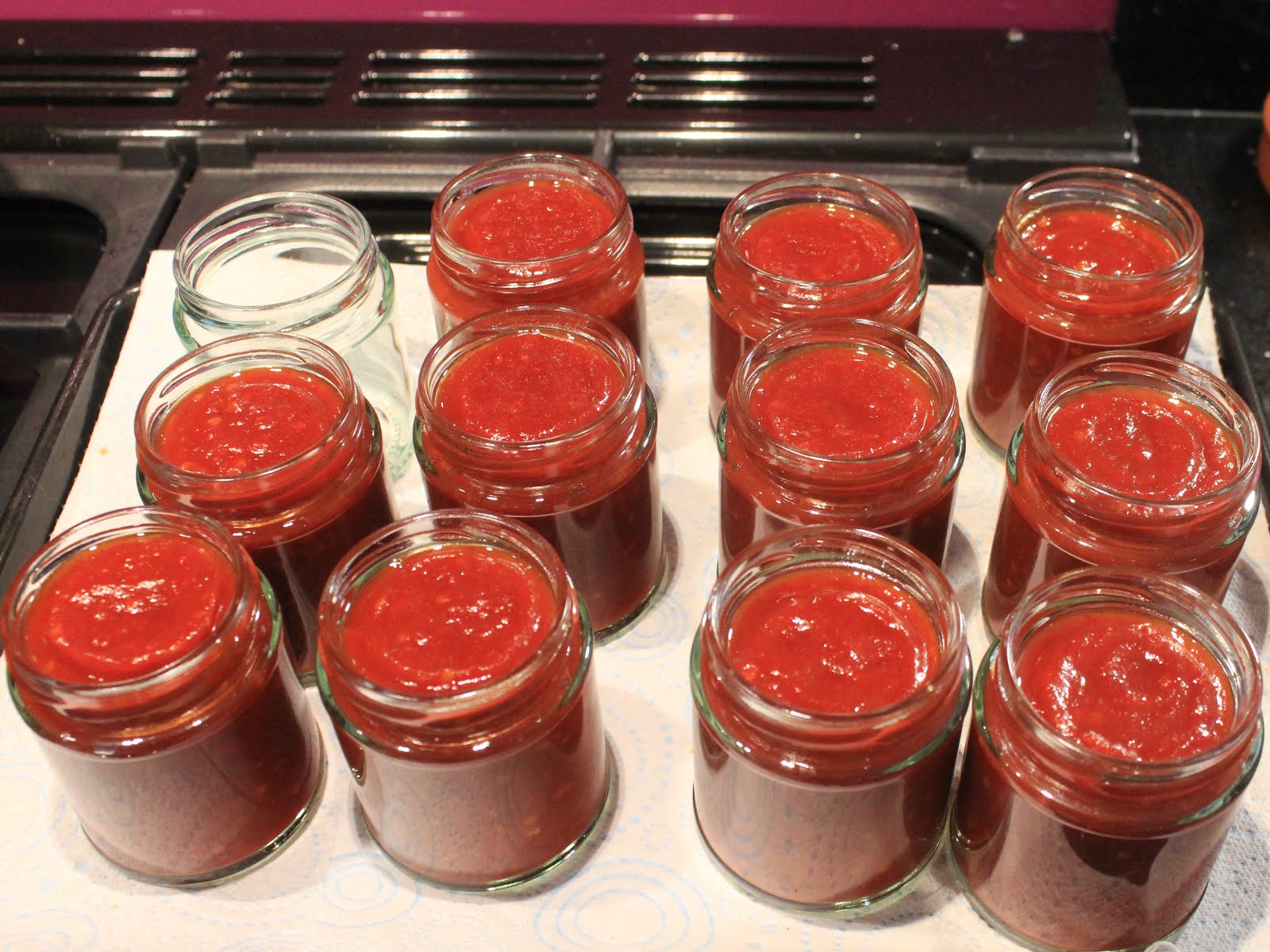 I am able to report that this is the hottest that she has ever made, in fact it is eye wateringly hot, it's quite delicious too. Even cooling down in its lidless jars it looks quite explosive so the next stage is to sterilise the lids and stick the labels on.